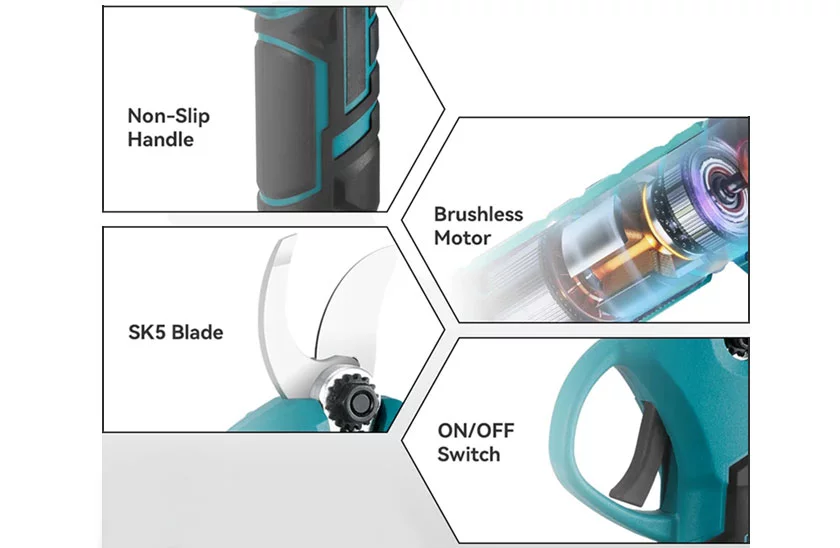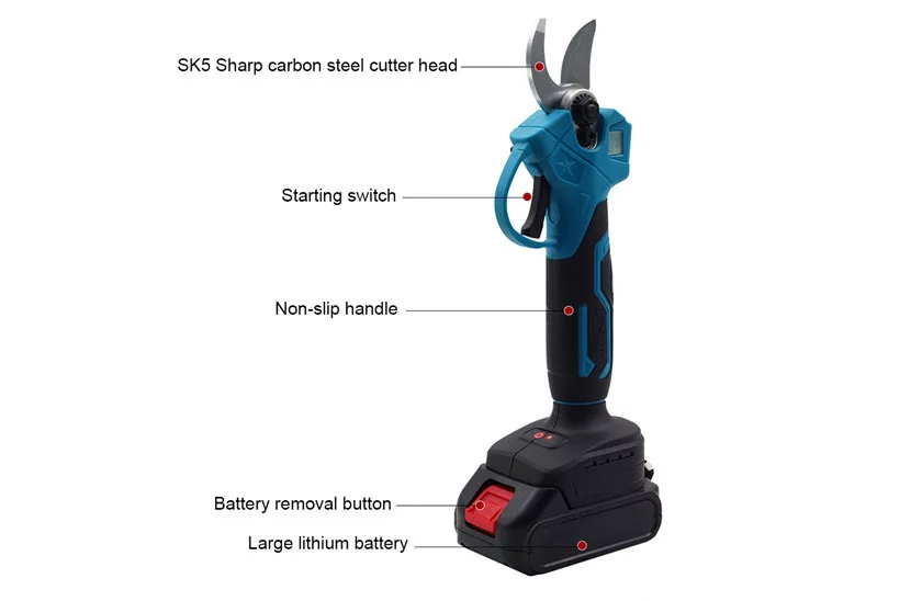 Nożyce poradzą sobie z twardszymi gałęziami o średnicy do 32 mm. Czytelny wyświetlacz LED pokazuje liczbę cięć oraz poziom naładowania baterii. Uruchamianie odbywa się za pomocą mikroprzełącznika, a sygnał dźwiękowy zwiększa bezpieczeństwo. Cały zestaw zapakowany jest w solidną walizkę z uchwytem, dzięki czemu łatwo go zabrać ze sobą w teren.