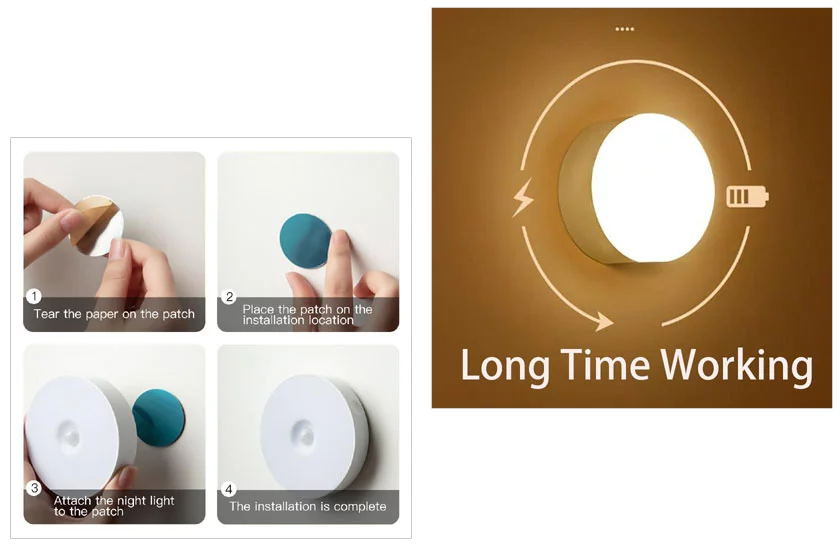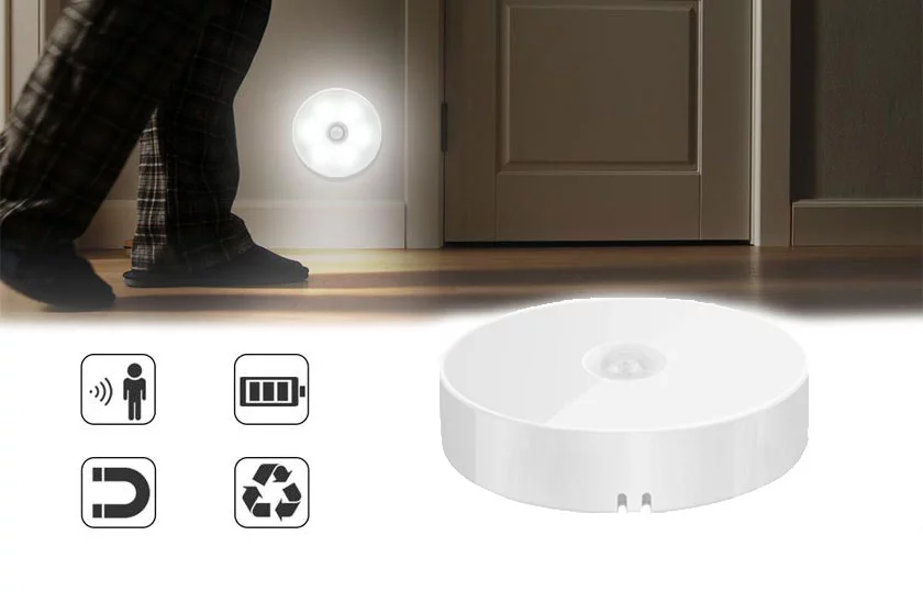 Lampka nocna LED na czujniku. Praktyczne oświetlenie nocne w domu i miejscu pracy. Idealna do oświetlenia pokoju, korytarza, klatki schodowej, szafy itp. Nocna lampka LED ma postać małej okrągłej lampki. Możesz zastosować światło LED w dowolnej przestrzeni. Aktywuje się i świeci przy ruchu.