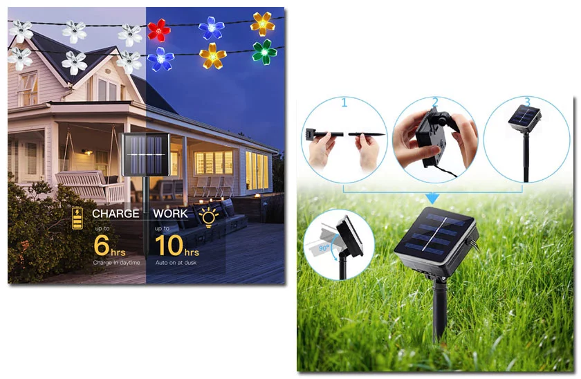 Klasyczny łańcuch solarny LED zasilany jest panelem słonecznym. W dzień ładuje, w nocy lampka włącza się sama. Wystarczy odpowiednio ułożyć ten łańcuch, wyobraźnia nie ma granic, można udekorować dowolne drzewko w ogrodzie, werandę, pergolę, bramę, płot i nie trzeba się martwić o zasilanie. Ponieważ produkt posiada panel słoneczny, który w ciągu dnia ładuje akumulatory w skrzynce sterującej, a czujnik ściemniania automatycznie przełącza się w tryb oświetlenia w nocy.