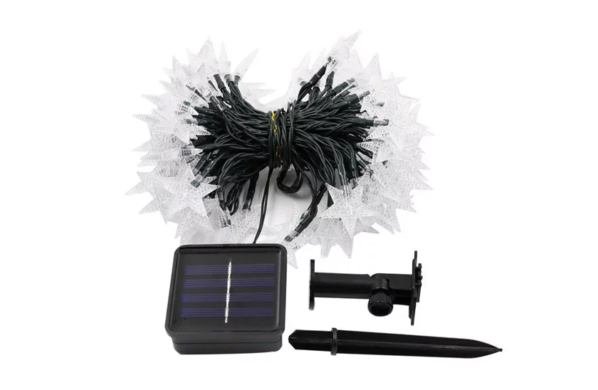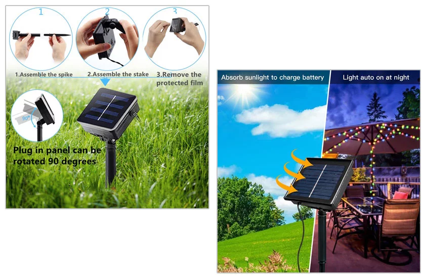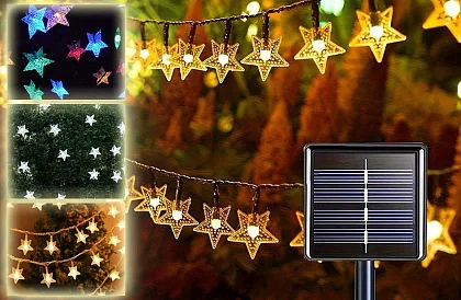 Klasyczny łańcuch solarny LED zasilany jest panelem słonecznym. W dzień ładuje, w nocy lampka włącza się sama. Wystarczy odpowiednio ułożyć ten łańcuch, wyobraźnia nie ma granic, można udekorować dowolne drzewko w ogrodzie, werandę, pergolę, bramę, płot i nie trzeba się martwić o zasilanie. Ponieważ produkt posiada panel słoneczny, który w ciągu dnia ładuje akumulatory w skrzynce sterującej, a czujnik ściemniania automatycznie przełącza się w tryb oświetlenia w nocy.