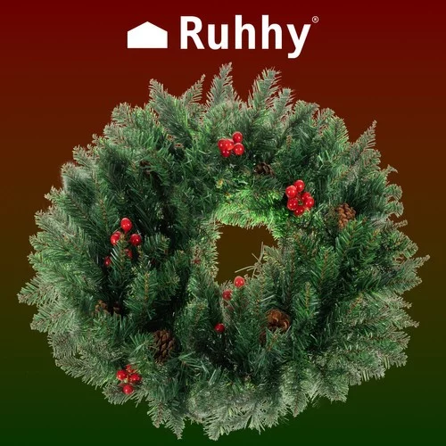 Uniwersalny wieniec można wykorzystać do dekoracji wnętrz i przestrzeni zewnętrznych, na przykład drzwi, balustrad, salonu czy przedsionka. Dzięki sztucznym igłom, szyszkami i czerwonym kulkami wprowadza stylowy i świąteczny wygląd.