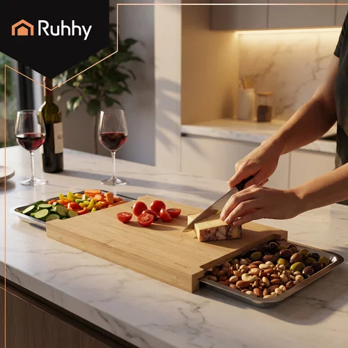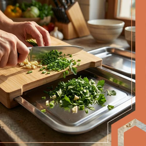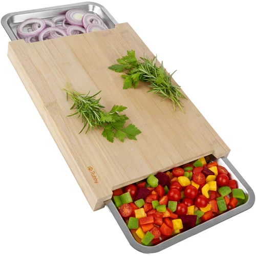 Deska ułatwia krojenie, sortowanie i przenoszenie składników, dzięki dwóm wysuwanym pojemnikom można pracować szybciej i czyściej. Naturalny bambus jest odporny, higieniczny i elegancki, podczas gdy stalowe pojemniki umożliwiają wygodne przechowywanie pokrojonych produktów lub resztek. Idealne do efektywnego gotowania w domu i w profesjonalnych kuchniach.