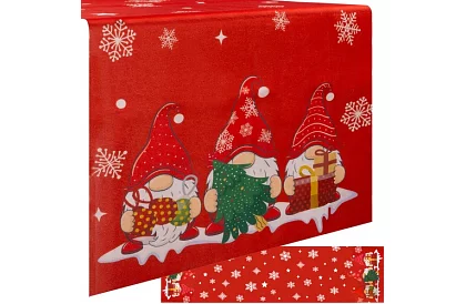 Bieżnik dodaje świąteczną atmosferę i ociepla każdy wystrój. Delikatny wzór śnieżynków i gwiazd uzupełniony uroczymi elfami z prezentami na końcach tworzy magiczną scenerię dla świątecznego stołu. Wytrzymały poliester zapewnia długą żywotność, a krawędzie cięte laserowo zapobiegają strzępieniu się nici, dzięki czemu bieżnik jest praktyczny, łatwy w utrzymaniu i gotowy na wiele sezonów.