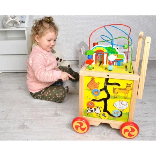 Pchacz z interaktywną kostką przynosi zabawę i wsparcie w nauce pierwszych kroków. Dziecko uczy się prawidłowego trzymania ciała, rozwija koordynację i jednocześnie odkrywa kreatywne aktywności na każdej stronie kostki. Dzięki odczepianej pętli z koralikami może bawić się również samodzielnie. Naturalne drewno i ekologiczny design zapewniają bezpieczeństwo, odporność i długą żywotność zabawki.