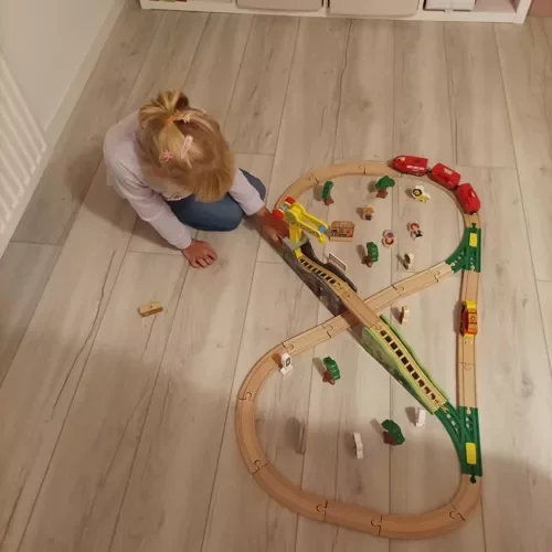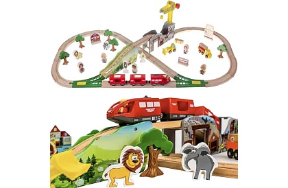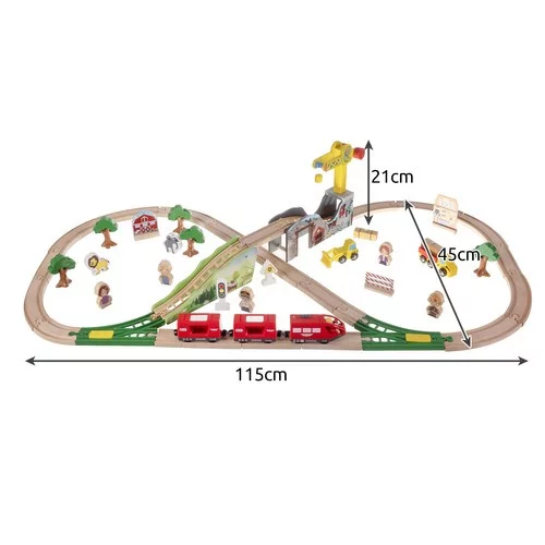 Duża zestaw drewnianych torów kolejowych oferuje 57 starannie wykonanych i szczegółowo wykończonych elementów, z którymi dziecko może zbudować własny tor i krajobraz wokół niego. Magnetyczne połączenie pociągów zapewnia bezpieczne i mocne połączenie, podczas gdy akcesoria takie jak drzewa, budynki, figurki i dźwig pobudzają kreatywność i godziny zabawy.