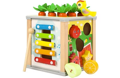 • Multifunkcyjna 5w1 – ksylofon, sorter kształtów, zębatki, zegar, robaki z magnesem i marchewką