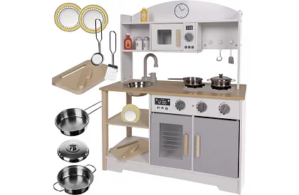 Fantastyczna drewniana kuchnia, która pobudza dziecięcą wyobraźnię, wspiera kreatywność i umożliwia godziny zabawy w gotowanie. Analogowe zegary, ruchome pokrętła, otwierane drzwi i wyjmowany zlew zapewniają realistyczne doświadczenie, które uczy dzieci samodzielności i podstaw gotowania. W zestawie znajdują się również praktyczne akcesoria, które naśladują prawdziwe środowisko kuchenne.