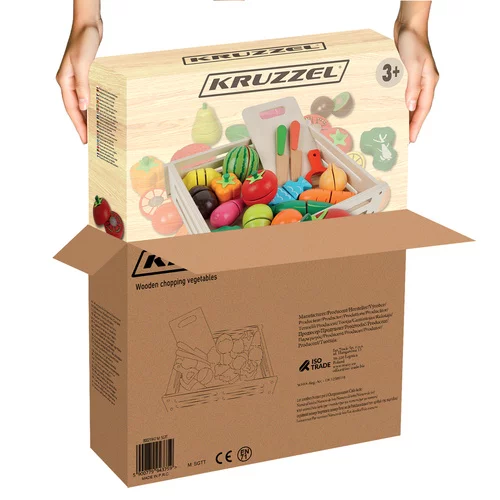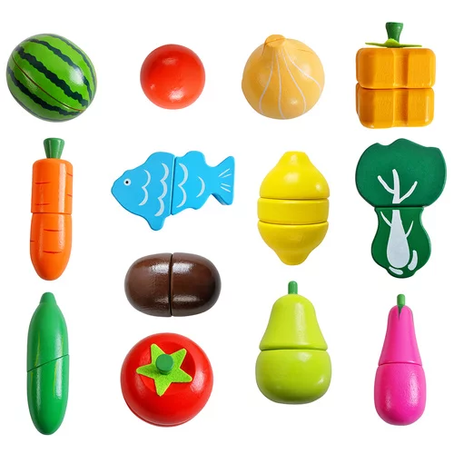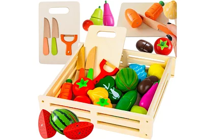 Kolorowy drewniany zestaw owoców i warzyw zapewnia dzieciom zabawną grę w gotowanie, sklep lub dom. Dzięki realistycznemu wykonaniu, możliwości krojenia i ponownego łączenia dzieci naturalnie rozwijają motorykę, wyobraźnię i umiejętności społeczne. Zabawka wspiera kreatywność, naukę kolorów, kształtów i podstaw liczenia, a jednocześnie oferuje sensowną zabawę na długie godziny.