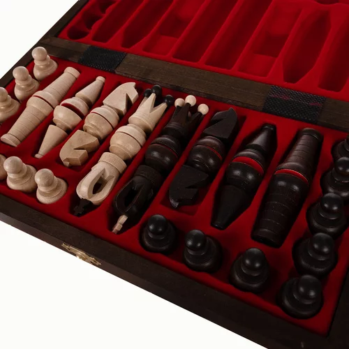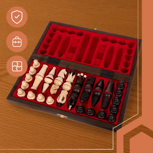 Stylowy zestaw szachowy z naturalnego drewna grabowego łączy tradycyjną grę z designerskim dodatkiem do wnętrza. Precyzyjnie rzeźbione figury, półmatowy lakier i klasyczne wykończenie kolorystyczne nadają zestawowi luksusowy wygląd. Praktyczna szachownica w formie zamykanej walizki z wewnętrznymi przegródkami zapewnia bezpieczne przechowywanie wszystkich figur i wygodne przenoszenie.