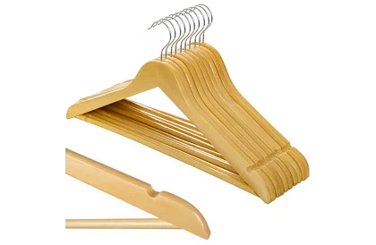 Eleganckie drewniane wieszaki wprowadzają porządek, przejrzystość i długotrwałą ochronę odzieży do garderoby. Lite drewno z delikatnym bezbarwnym lakierem zapewnia wysoką odporność, naturalny wygląd i ochronę przed wilgocią oraz zarysowaniami. Ergonomiczny kształt pomaga zachować naturalny kształt odzieży, zmniejsza ryzyko pogniecenia i nadaje garderobie jednolity, czysty styl.