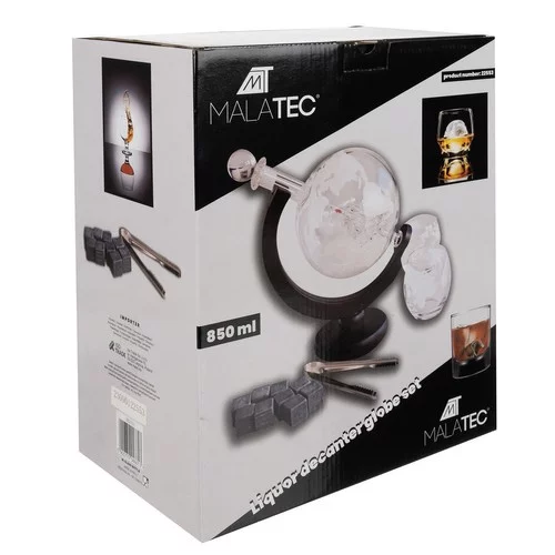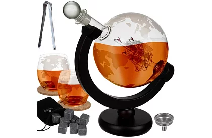 Luksusowy zestaw dla miłośników whisky i podróży, który łączy elegancję i funkcjonalność. Karafka w kształcie kuli ziemskiej z drewnianym stojakiem, szklankami, korkowymi podkładkami i kamiennymi kostkami chłodzącymi zapewnia stylowe doznania degustacyjne. Statek wewnątrz karafki tworzy unikalny efekt podczas nalewania napoju.