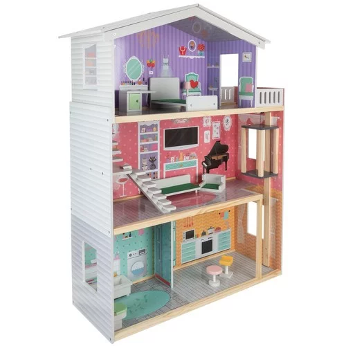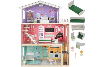 Przestronny drewniany domek dla lalek jest idealny dla dwóch lalek. Oferuje 3 piętra, 4 pokoje i balkon, dzięki czemu każda lalka będzie miała swój wymarzony dom. Domek wspiera wyobraźnię i kreatywność podczas zabawy i pozwala dzieciom tworzyć własne historie oraz aranżować wnętrza.