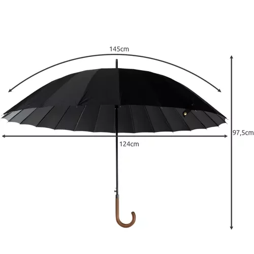 Duży parasol oferuje nadzwyczajnie elegancki wygląd, odpowiedni dla kobiet i mężczyzn, i zapewnia doskonałą ochronę przed deszczem dzięki dużej kopule. Solidna konstrukcja zapewnia stabilność nawet przy silnym wietrze, a drewniany uchwyt zapewnia wygodny i bezpieczny chwyt. Dzięki systemowi One Click otwieranie i zamykanie jest szybkie, bezpieczne i delikatne, bez rozpryskującej się wody naokoło.
