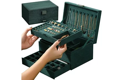 Stylowa i praktyczna szkatułka na biżuterię pomoże Ci uporządkować całą Twoją kolekcję biżuterii w jednym miejscu. Dzięki przemyślanej wewnętrznej strukturze z licznymi przegródkami, haczykami i kieszeniami łatwo przechowasz pierścionki, naszyjniki, bransoletki, zegarki i kolczyki bez ryzyka splątania lub uszkodzenia. Elegancki zamszowy powierzchni w połączeniu z srebrnymi detalami nadaje szkatułce luksusowy wygląd, który pasuje do każdego wnętrza.