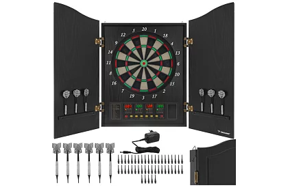 Przynoszą domową rozrywkę pełną rywalizacji i napięcia dla pojedynczych graczy i całej rodziny. Automatyczne punktowanie, 27 gier i 243 warianty gier, możliwość gry dla maksymalnie 16 graczy, solidna osłona z drzwiami i eleganckie drewniane drzwi zapewniają pubową atmosferę prosto u Ciebie w domu. Praktyczna konstrukcja tarczy chroni tarcze przed uszkodzeniem, utrzymuje strzały w zasięgu ręki i umożliwia wygodne ustawienie poziomu trudności dla każdego gracza.