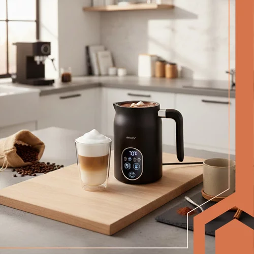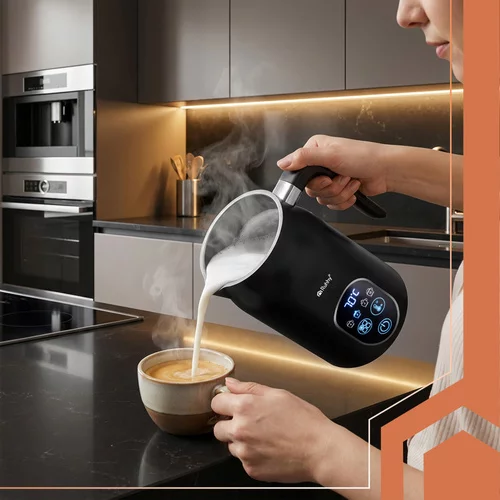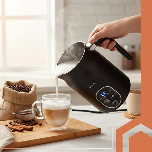 Elegancki pomocnik dla miłośników kawy, który w ciągu kilku sekund stworzy gęstą i kremową piankę mleczną jak z kawiarni. Dzięki 4 trybom podgrzewania i wielofunkcyjnemu zastosowaniu poradzi sobie z gorącym i zimnym spienianiem, podgrzewaniem mleka lub przygotowaniem gorącej czekolady. Nowoczesny wyświetlacz LED umożliwia precyzyjną kontrolę temperatury i trybu, dzięki czemu każdy napój przygotujesz dokładnie według gustu.