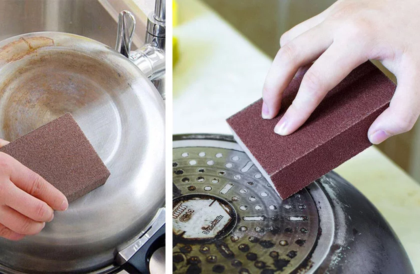 Magiczna gąbka ścierna specjalnie zaprojektowana do przypaleń, smaru i brudu na metalowych przedmiotach. Gąbka w bardzo prosty, szybki i skuteczny sposób usunie wszelkie zabrudzenia z garnków, ale także z czarnego dna patelni, brudnych desek do krojenia, czy zatłuszczonych pieców, zlewozmywaków czy nawet grilli.