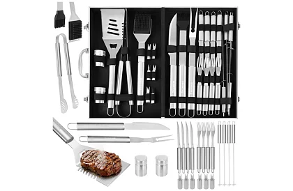 • Wymiary elementów: noże do steków (4 szt.) 24 x 1,6 cm, widelce (4 szt.) 23 x 1,7 cm, uchwyty do kukurydzy (6 szt.) 6,5 x 1,2 cm, łopatka 40,5 x 9 cm, druciana szczotka 39,5 x 6,5 cm, duży nóż 41 x 3 cm, szczypce 41 x 5 cm, widły do grilla 41,5 x 2,6 cm, szpikulce (4 szt.) 40,7 x 2,2 cm
