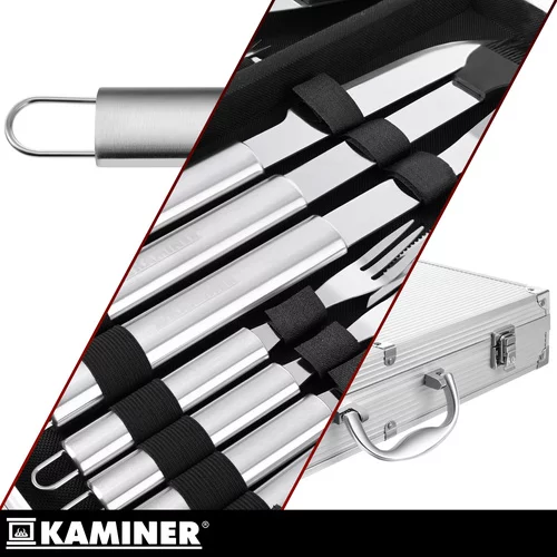 Już nigdy nie będziesz musiał szukać potrzebnych narzędzi do grillowania. Zestaw Kaminer oferuje kompletny sprzęt do grillowania i serwowania w jednym praktycznym aluminiowym kufrze, dzięki czemu wszystko masz w jednym miejscu i gotowe do użycia. Idealny na ogród, wycieczki lub piknik, zestaw zapewnia wygodę, szybki dostęp i łatwą organizację podczas przygotowywania posiłków.