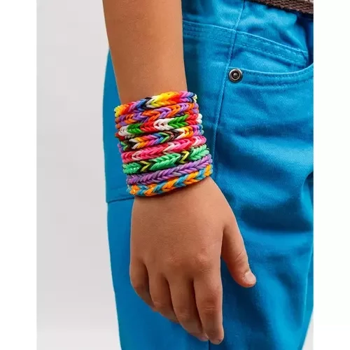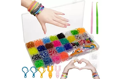 Duża zestaw gumek do tworzenia bransoletek, figurek, pierścionków, torebek i innych dekoracji. Zawiera wszystko, co potrzebne – gumki, haczyki, karabinki i ozdobne elementy, w tym zawieszki z literami i koraliki. Dzięki praktycznemu przezroczystemu organizerowi z przegródkami gumki pozostają uporządkowane i nie plączą się.