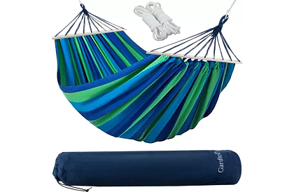 Wygodna huśtawka dla dwóch osób jest idealna do relaksu w ogrodzie, na tarasie lub w pomieszczeniu. Wykonana z przyjemnej bawełny z niewielką ilością poliestru, zapewnia komfort i odpowiednią wentylację. Dzięki drewnianym poprzeczkom rozkłada się jak łóżko i umożliwia swobodne leżenie, czytanie lub relaks. W zestawie znajdują się liny i pokrowiec do łatwego montażu i przenoszenia, dzięki czemu możesz cieszyć się relaksem gdziekolwiek.