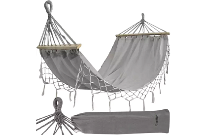 Hamak do ogrodu, na taras lub balkon zapewnia maksymalny komfort i relaks. Dzięki miękkiemu i wytrzymałemu materiałowi można w nim wygodnie opalać się, czytać lub po prostu odpoczywać. Drewniane belki rozkładają hamak w wygodnej pozycji jak łóżko, a plecione sznurki zapewniają bezpieczne zawieszenie. Hamak nadaje się do stałej instalacji oraz do przenoszenia na plażę czy w podróże.