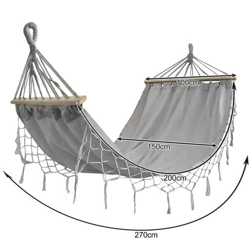 Stabilna i wytrzymała huśtawka oferuje wygodne miejsce do odpoczynku dla jednej lub dwóch osób. Masywne drewniane pręty i mocne liny zapewniają bezpieczne zawieszenie, podczas gdy oddychający materiał z bawełny i poliestru zapewnia komfortowe i wytrzymałe leżenie w ogrodzie, na tarasie lub balkonie.