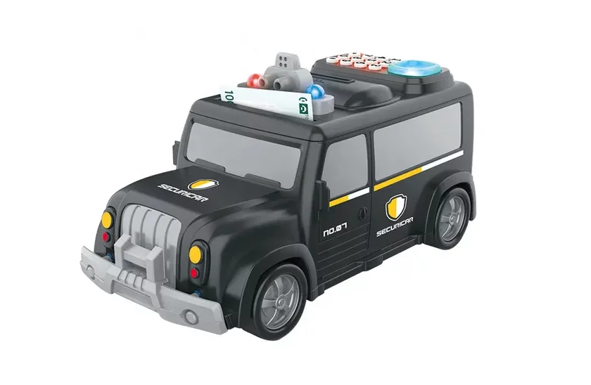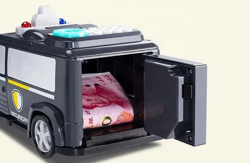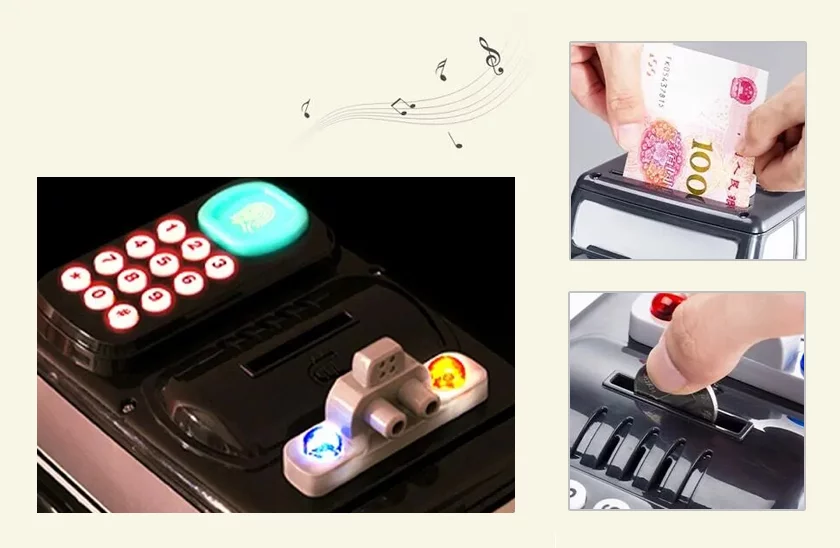 Skarbonka posiada osobny otwór na monety i banknoty. Monety są wrzucane, a banknoty są automatycznie wyciągane przez kasę, gdy zbliżasz się do otworu z banknotem.