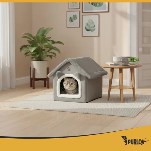 Miękki pluszowy legowisko z zamkniętą budką tworzy idealne miejsce do codziennego odpoczynku i poczucia bezpieczeństwa. Otaczające ściany wraz z miękką poduszką zapewniają przytulną przestrzeń, w której kot może wygodnie zdrzemnąć się lub schować przed zgiełkiem domowym. Przyjemny pluszowy materiał utrzymuje ciepło w chłodniejsze dni, a jednocześnie zapewnia komfort przez cały rok.