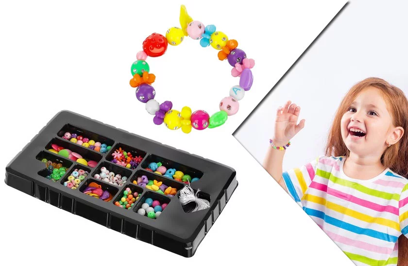 DIY zestaw do tworzenia biżuterii dla dzieci. Wszystkie elementy zestawu są starannie wypolerowane i zaokrąglone, aby zapewnić bezpieczeństwo dzieciom. Zestaw wykonany jest z nietoksycznych materiałów, a koraliki z trwałych surowców, dzięki czemu można ich używać wielokrotnie.
