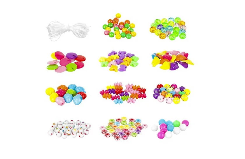 Zestaw zawiera 11 rodzajów koralików o różnych kształtach i kolorach oraz elastyczny sznurek do tworzenia bransoletek i naszyjników.