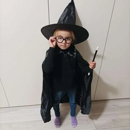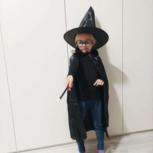 Kostium czarodzieja zamienia każde dziecko w małego czarodzieja. Czarny płaszcz dodaje tajemniczości i elegancji, wysoki kapelusz zaskakuje efektownym rozłożeniem, a magiczna różdżka wraz z okrągłymi okularami doskonale dopełniają magiczną postać. Idealny na imprezy kostiumowe, przedstawienia teatralne lub zabawę w domu, gdzie wyobraźnia nie zna granic.