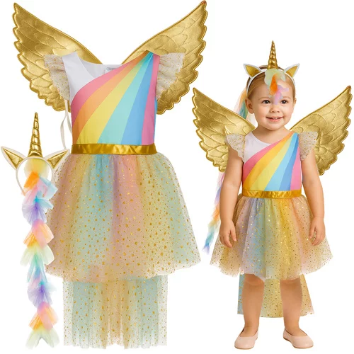 Czarowny kostium zamieni każdą małą księżniczkę w gwiazdową postać. Kompletny zestaw zawiera sukienkę, złote skrzydła i opaskę z rogiem, dzięki czemu jest gotowa do natychmiastowej zabawy, na bal karnawałowy, imprezę Halloween, urodziny lub szkolne przedstawienie. Kostium jest lekki, wygodny i uniwersalny, więc dziecko może nosić swoje czary przez cały rok.
