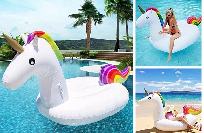 Piękny gigantyczny dmuchany materac w kształcie wyjątkowego kolorowego jednorożca. Dmuchany jednorożec ożywi niejeden ogródek przy basenie. Doskonała ozdoba na lato nie tylko na święta, które musisz mieć. Idź z duchem czasu i kup ten dmuchany leżak. Zobacz, jak błyszczysz w wodzie!
