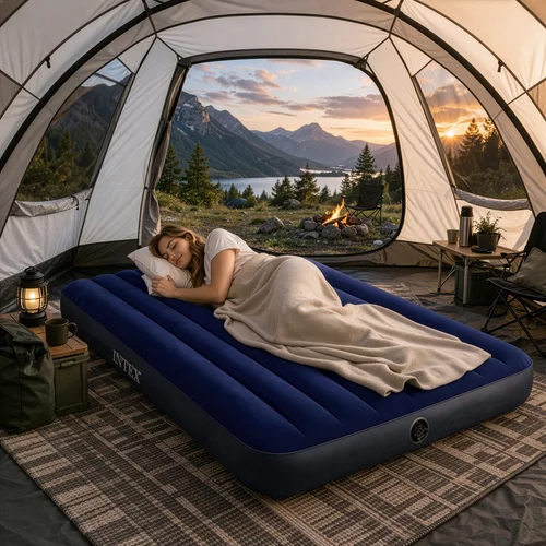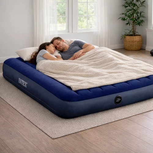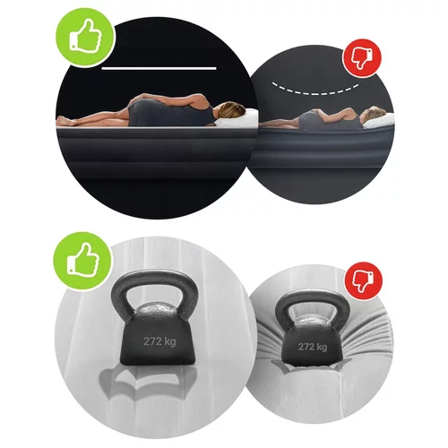 Wygodny materac dmuchany to idealne rozwiązanie dla gości, na działkę lub w podróży, gdzie potrzebujesz szybko stworzyć pełnowartościowe miejsce do spania. Dzięki technologii Fiber-Tech zapewnia stabilniejsze wsparcie ciała, dzięki czemu materac mniej się ugina i zapewnia komfortowy sen bez nieprzyjemnego „zapadania”.