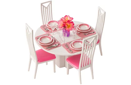 • Duży zestaw 43 elementów – stół, 4 krzesła, naczynia, sztućce, kieliszki i wazon z kwiatami