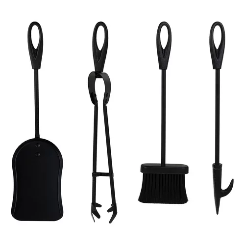 Zestaw retro narzędzi kominkowych łączy szuflę, miotłę, szczypce i stojak w elegancki i praktyczny zestaw do kominków, pieców, ognisk lub grilli. Wysokiej jakości stal nierdzewna zapewnia odporność na wysokie temperatury i codzienne użytkowanie, podczas gdy czarna matowa powierzchnia nadaje vintage wygląd i dodatkową ochronę. Narzędzia mają ergonomiczne uchwyty, które dobrze leżą w dłoni i umożliwiają bezpieczne manewrowanie gorącym ogniem, a stabilny stojak z trzema nogami trzyma cały zestaw mocno na miejscu.