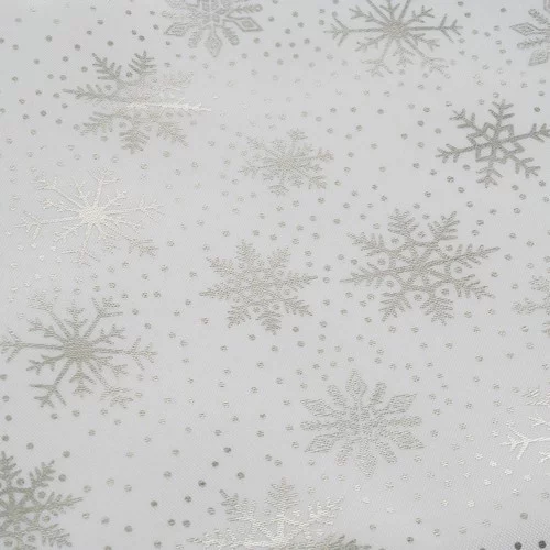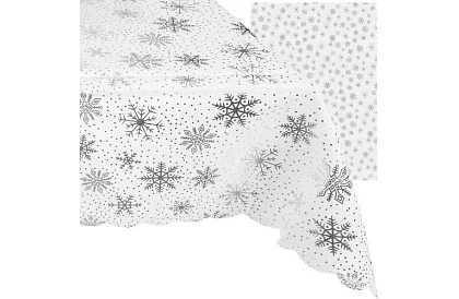 Świąteczny obrus dodaje świąteczną atmosferę i tworzy w domu przytulne i magiczne otoczenie. Delikatny srebrny nadruk z płatkami śniegu i kropkami zachwyca swoją elegancją i pasuje do świątecznych dekoracji oraz bieżników na stół. Odporna powierzchnia chroni stół przed plamami i zarysowaniami podczas serwowania potraw i napojów, a materiał poliestrowy zapewnia długą żywotność i łatwą konserwację.