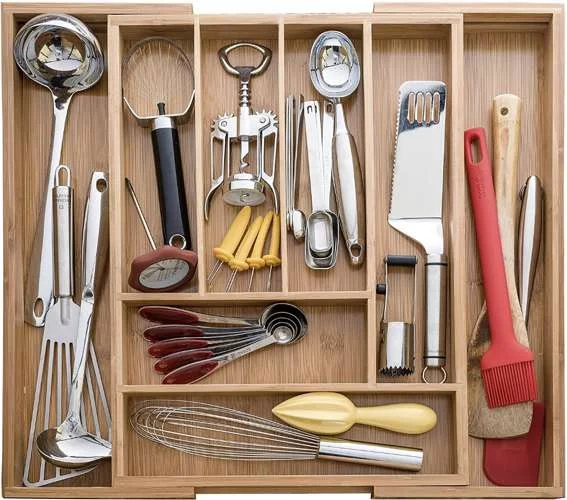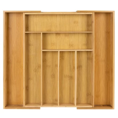 Praktyczny i elegancki pomocnik do przejrzystego uporządkowania sztućców i akcesoriów kuchennych. Dzięki rozszerzalnej konstrukcji dostosowuje się do rozmiaru szuflady i oferuje 6 do 8 przegródek w zależności od potrzeb. Naturalne drewno bambusowe wygląda estetycznie, jest higieniczne i odpowiednie do codziennego użytku w nowoczesnej i klasycznej kuchni. Organizer pomaga utrzymać porządek, chroni sztućce i zapewnia szybki dostęp podczas gotowania i jedzenia.