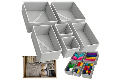 Organizer do szuflady umożliwia przejrzyste uporządkowanie bielizny, skarpet i akcesoriów. Dzięki stabilnej konstrukcji dna z zamkiem organizery zachowują kształt nawet po umieszczeniu w szufladzie i łatwo dostosowują się do przestrzeni. Materiał z włókniny jest odporny na codzienne użytkowanie, łatwo się czyści, a jasnoszary kolor dodaje elegancji, pasuje do każdej szafy. Zestaw sześciu sztuk zawiera małe, średnie i duże organizery, dzięki czemu można stworzyć idealne uporządkowanie dla różnych typów rzeczy.