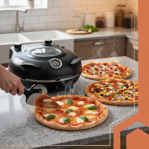 Mini piec przynosi do domowej kuchni autentyczny smak włoskiej pizzerii. Osiąga temperaturę do 420 °C dzięki ceramicznemu kamieniowi, który zapewnia chrupiącą skórkę i równomierne pieczenie. Przezroczysta pokrywa, cyrkulacja powietrza i timer umożliwiają doskonałą kontrolę i wygodne pieczenie. W zestawie znajduje się praktyczna e-książka z przepisami dostępna za pomocą kodu QR – inspiracje na pizze, focaccie i inne pieczywo prosto w domu.
