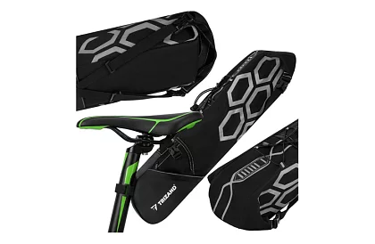 Praktyczna torba pod siodło znacznie zwiększa przestrzeń ładunkową podczas jazdy na rowerze i umożliwia posiadanie wszystkich ważnych rzeczy zawsze pod ręką. Dzięki pojemności 12 l pomieści wygodnie narzędzia, odzież i rzeczy osobiste. Wodoodporna konstrukcja chroni zawartość przed deszczem i zanieczyszczeniami, podczas gdy stabilne mocowanie zapewnia pewność nawet podczas jazdy w terenie. Lekki i aerodynamiczny design przyczynia się do komfortu na krótszych i dłuższych trasach.