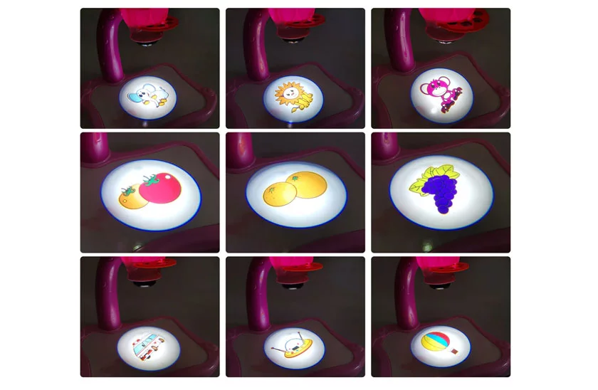 Do montażu nie potrzebujesz żadnych narzędzi. Po zmontowaniu włóż baterie. Wybierz slajd z obrazami, włóż go do głowicy projektora, włącz i skieruj projektor na stół. Dzieci mogą śledzić wyświetlany obraz.
