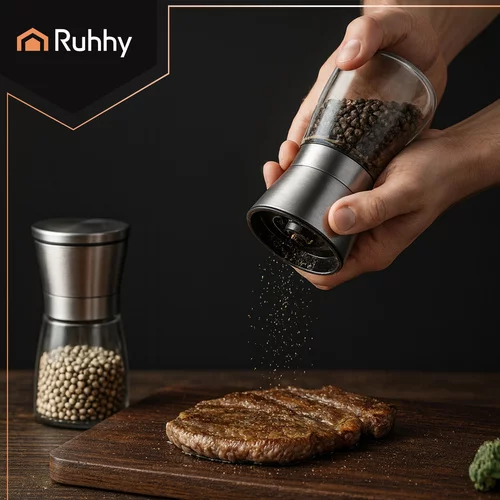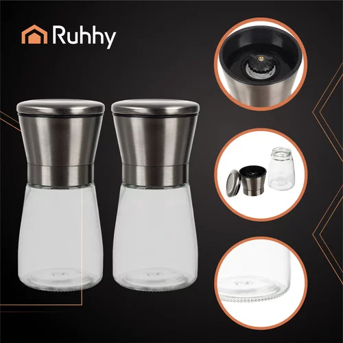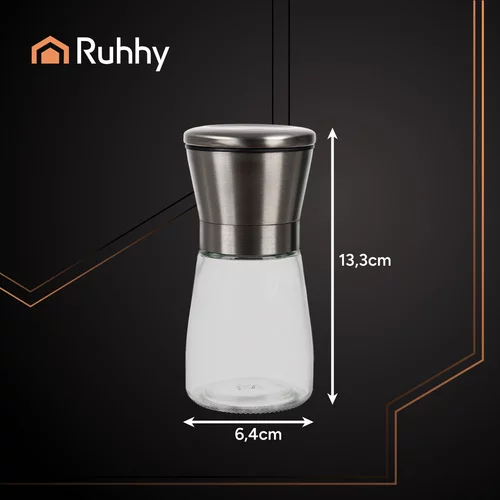 Elegancki i praktyczny zestaw szklanych młynków RUHHY oferuje możliwość świeżego mielenia przypraw bezpośrednio podczas gotowania lub serwowania. Przezroczyste szkło umożliwia kontrolę ilości przypraw, metalowa pokrywka nadaje nowoczesny wygląd, a ceramiczny mechanizm zapewnia dokładne ręczne mielenie dla pełnego smaku i aromatu każdego dania. Zestaw jest idealny do codziennego użytku oraz eleganckiego nakrycia stołu.