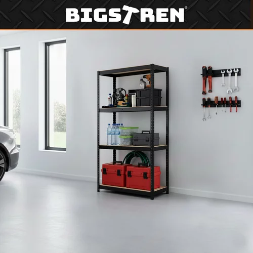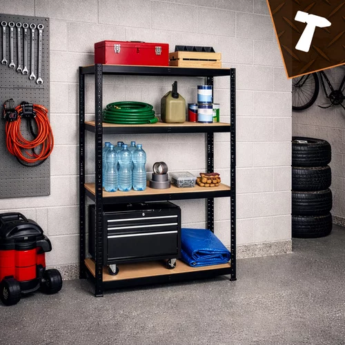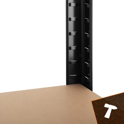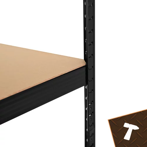 Stabilny i wytrzymały czarny regał magazynowy oferuje praktyczne rozwiązanie do przechowywania przedmiotów w sposób uporządkowany i bezpieczny. Solidna stalowa konstrukcja z profilami oraz wzmocnionymi półkami MDF zapewnia wysoką nośność i długą żywotność. Regulowana wysokość półek, montaż bez śrub oraz system 3 w 1 umożliwiają łatwe dostosowanie regału do różnych potrzeb, co czyni go idealnym wyborem do garaży, magazynów, piwnic i domów.