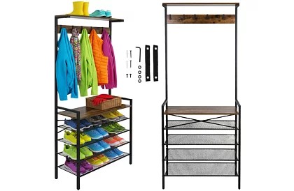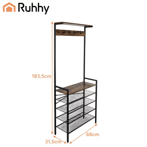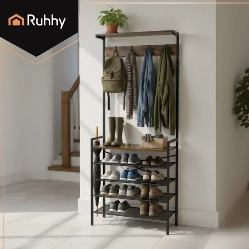 Wolnostojąca ściana łączy elegancję i funkcjonalność i pomaga utrzymać kurtki, buty i akcesoria zawsze pod ręką. Solidna metalowa rama zapewnia stabilność, cztery przestronne półki i pięć praktycznych haków utrzymują rzeczy uporządkowane i przejrzyste, podczas gdy górna półka zapewnia miejsce na kapelusze i szaliki. Idealna do korytarzy, szatni i biur.