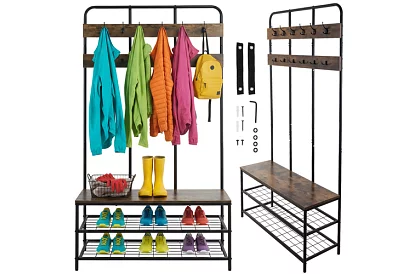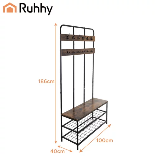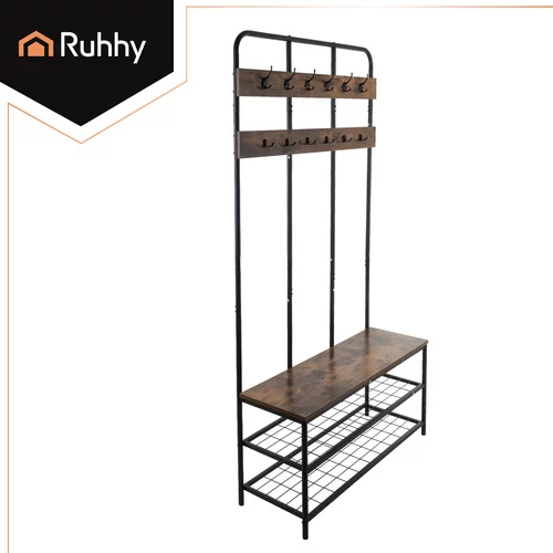 Praktyczne i eleganckie rozwiązanie dla porządku i wygody w przedpokoju. Oferuje przestronne półki na buty, siedzisko oraz 12 podwójnych haczyków na kurtki, płaszcze i torby, dzięki czemu wszystko ma swoje miejsce. Solidna metalowa konstrukcja oraz drewniane akcenty w stylu loftowym zapewniają trwałość i nowoczesny wygląd. Dzięki łatwemu montażowi można cieszyć się uporządkowaną przestrzenią w ciągu kilku minut.