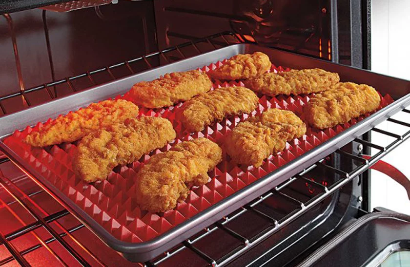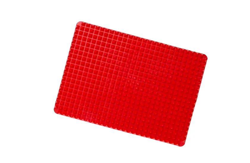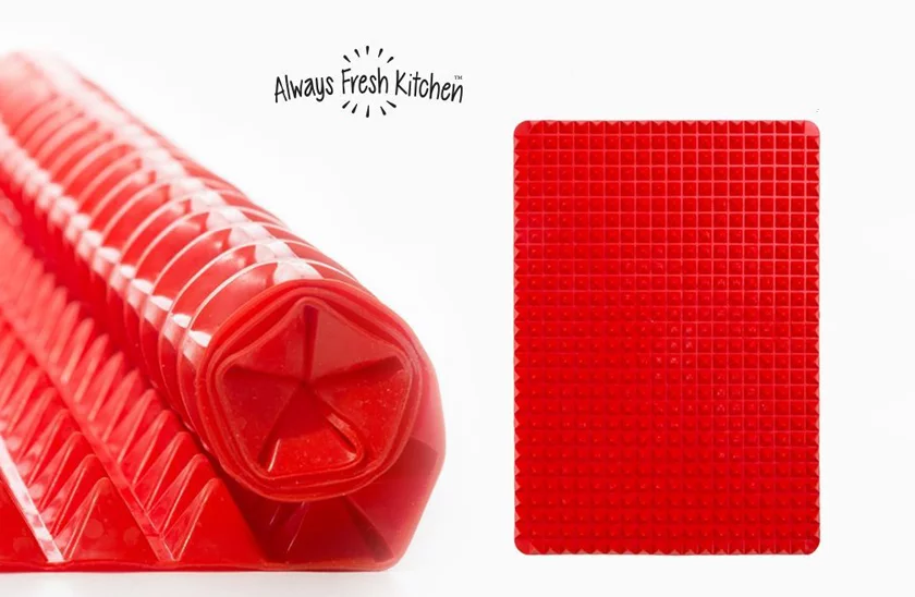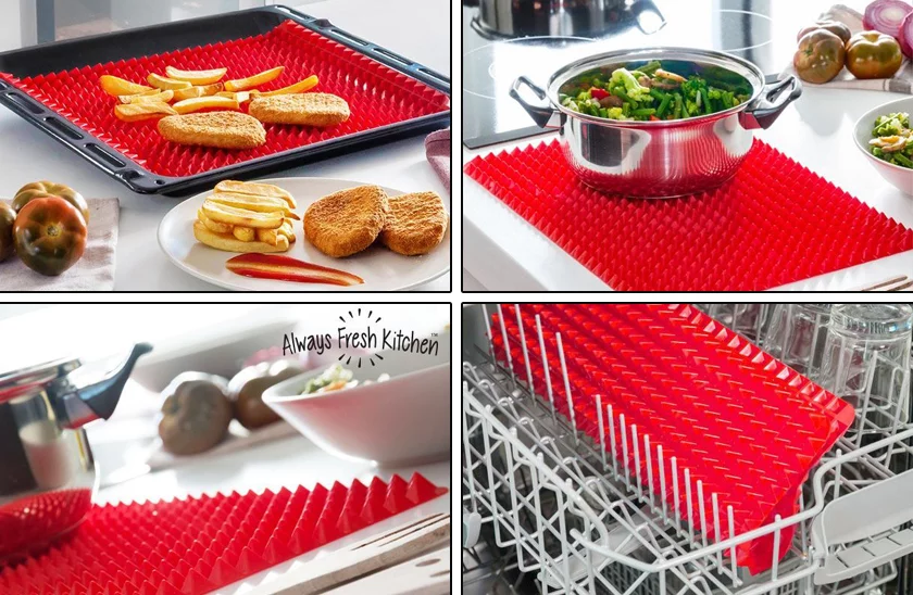 Zapomnij o papierze do pieczenia. Silikonowa mata do pieczenia jest doskonałym pomocnikiem w kuchni. Dzięki obróbce powierzchniowej pozbędziesz się nadmiaru tłuszczu. Wszystko, co przygotowujesz, jest chrupiące i równomiernie upieczone, gorące powietrze krąży ze wszystkich stron między piramidami. Mata nadaje się również do gorących potraw. Jego czyszczenie jest absolutnie proste, wystarczy spłukać gorącą wodą lub włożyć do zmywarki.