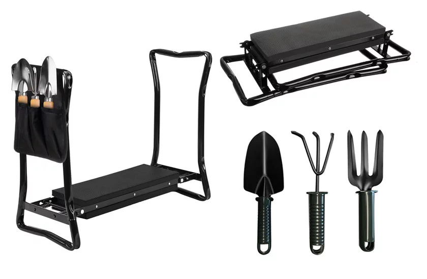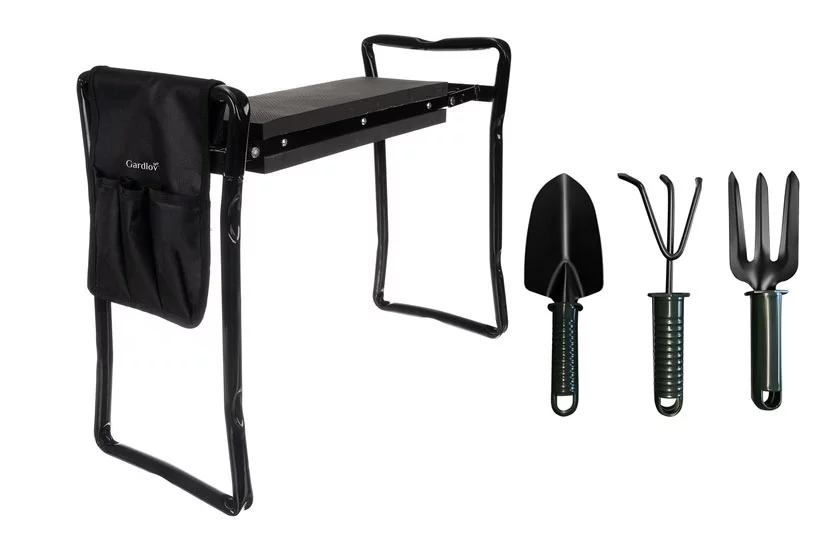 Wytrzymała stalowa rama udźwignie do 120 kg i zapewni stabilność nawet na nierównym terenie. Boczne blokady chronią przed przypadkowym złożeniem. W zestawie znajduje się praktyczny organizer na narzędzia oraz zestaw podstawowych narzędzi ogrodniczych – wszystko zawsze pod ręką.