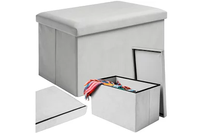 Pufa jest praktyczna i stylowa ozdoba do każdego wnętrza. Tapicerowana wodoodpornym aksamitem z wzmocnieniem z MDF zapewnia miękkie siedzisko i przestronną przechowalnię o pojemności 54 litrów, idealną na zabawki, koce lub drobiazgi. Dzięki składanej konstrukcji, solidnej budowie i maksymalnej nośności 80 kg łączy funkcjonalność z eleganckim wyglądem, odpowiednia do salonu, sypialni lub korytarza.